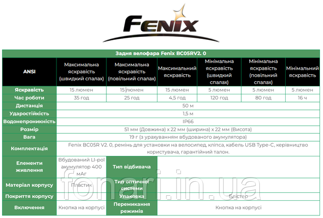 Габаритний ліхтар Fenix BC05R V2.0 є вдосконаленою версією попередньої велофари BC05R. Це досить невелика акумуляторна задня велофара з червоним світлом, зроблена для професіоналів і аматорів. Зіставити з попередньою моделлю, ця фара отримала яскравіше освітлення — на 50% більше, збільшили та час роботи — на цілих 67%, а також виріс кут огляду — зі 120 до 180 градусів, на 50%.